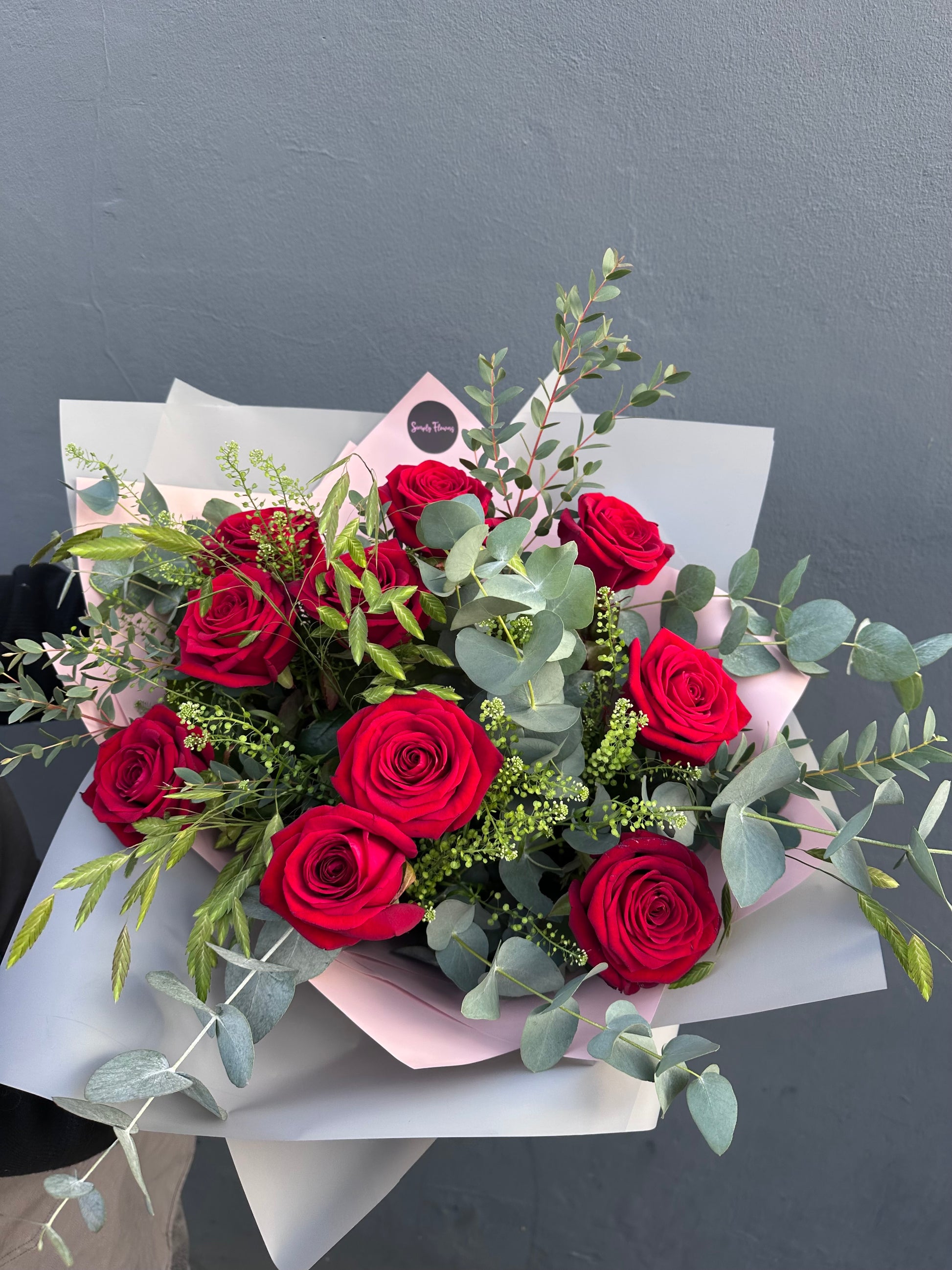 Simply Romance is a traditional bouquet of rich roses, thoughtfully arranged with complimentary foliage.